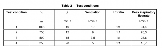 6.2.3.2 The HME shall be tested at those conditions specified in Table 2 which are within the range specified for the HME by the manufacturer, at the maximum tidal volume recommended by the manufacturer if this value is greater than 1 l, at a frequency of 1 0 breaths.min -1 , and an I:E ratio of 1 :1 .